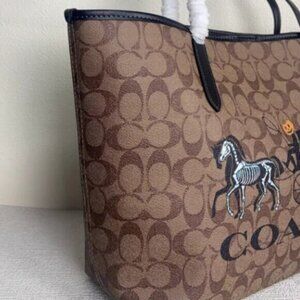 Signature coated canvas and smooth leather Inside zip pocket Snap closure Handles with 10" drop 13" (L) x 11 1/2" (H) x 6 1/4" (W)