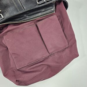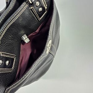 Vintage Coach Hamilton Hampton shoulder bag crafted from rich, pebbled black leather with contrast stitching and silver-tone hardware. Features a spacious main compartment, front exterior pocket with iconic turn lock closure, and a large slip pocket at the back for easy-access essentials. The interior is lined in burgundy fabric and includes a zippered pocket and two slip pockets for organization. Double shoulder straps offer comfortable wear, and the bottom corners show typical light wear from gentle use. A timeless Y2K Coach piece, celebrated for durability and effortless style; ideal for work, travel, and everyday use. Clean, well-cared-for condition, minor wear on bottom corners, minor discoloration on lining.