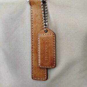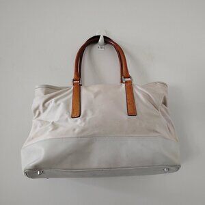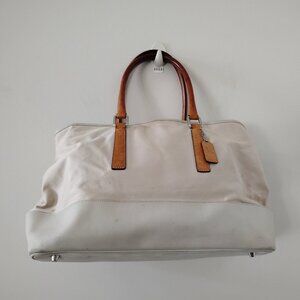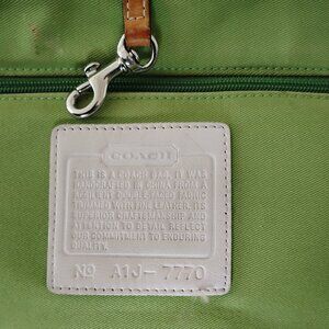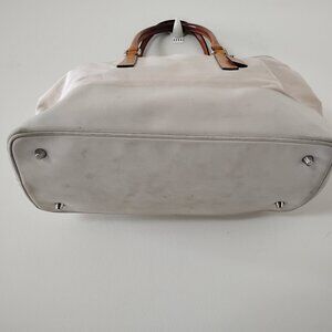 7770. Fair used condition. Footed pale pink canvas with bone leather, silver tone hardware. Tan leather straps, trim, and hang tag, green canvas lining. Dog clip closure. One inner zip pocket, two inner slip pockets. Approx. 14"Lx10"Hx7"W. Bag is perfectly usable as is but has many small spots, stains and/or discoloration. Needs a good cleaning. No dust bag.