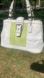 A rare and beautiful find from Coach’s Hampton collection! This limited edition Lindsey satchel is crafted in white leather with apple green stripe accents and a signature “C” jacquard center panel. Finished with silver hardware, a front buckle strap detail, double handles, and the classic Coach hangtag.