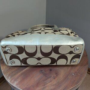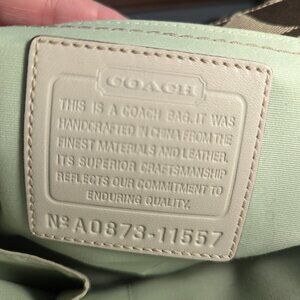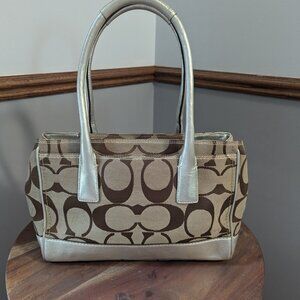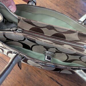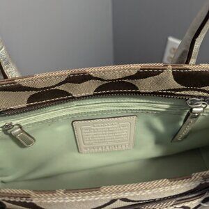 Coach signature satchel style 11557. Tan and brown Coach signature fabric with silver leather handles and silver hardware. Interior fabric in mint green. Size 13" by 18" by 4.5" with handles adding an additional 8" of height. Handles stand upright and do not fold down. Bag has a large center compartment with inside pockets for cell phone and a zipper pocket for personal items. The outside of the bag has additional narrow side compartments. Very good condition. One small brown mark on the inside of the bag near the zippered pocket (as pictured). Smoke-free home.