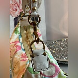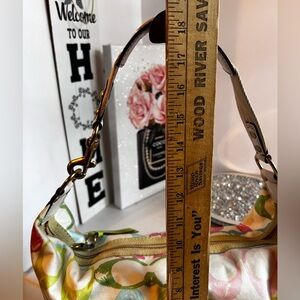 Chic hobo bag with vibrant multicolor pattern. Features front pocket and sturdy strap. Perfect for everyday style.