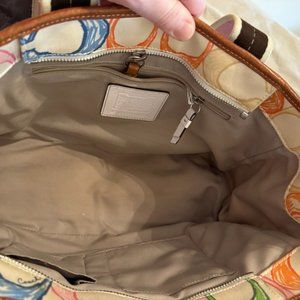 Cream colored Coach tote bag with multicolor Coach c pattern, pink straps, gray interior, comes with Coach dust bag. Used-good condition... This bag was cleaned by a professional designer bag cleaner.