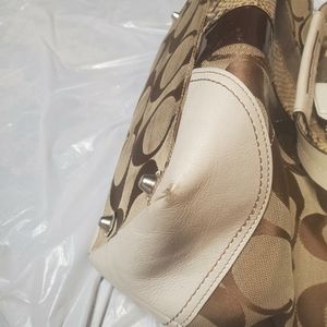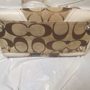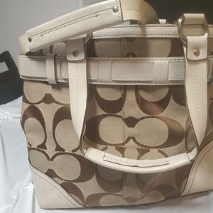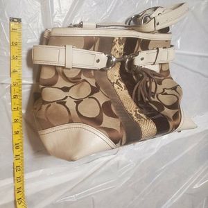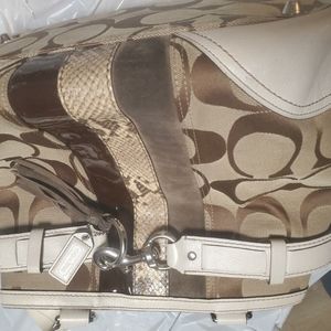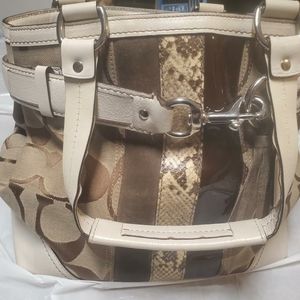 Beautiful COACH Hampton Python tote purse. The front has suede and snake skin. It is cream, tan, brown with white leather accents. The purse has the tag with serial number. It is in great condition. it does have some ware on the bottom corners. This is a vintage bag.