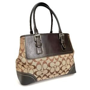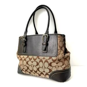 • Coach Signature jacquard canvas + dark brown leather trim/handles