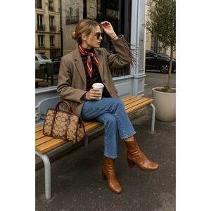Classic Coach with character. This Hampton-era Signature C satchel brings back early-2000s polish—structured, practical, and quietly luxe. The beige jacquard monogram canvas is framed in dark-brown leather (freshly cleaned + conditioned) with silver-tone hardware.