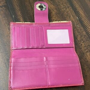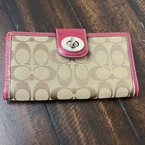 Stylish Coach wallet in signature canvas. Features bold red trim. Ideal for organizing essentials. Water-resistant and stain-resistant
