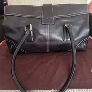 The Y2K Coach Hampton Soho Flap Handbag Purse 9550 in black leather is a vintage piece with a rectangular shape and magnetic closure.
