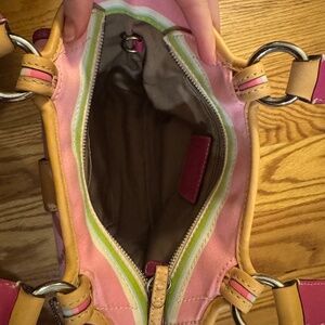 vintage coach hampton striped tote! big enough to still be a purse but not a “large bag.” VERY clean, no stains, no mess on the inside. Has original hang tag!