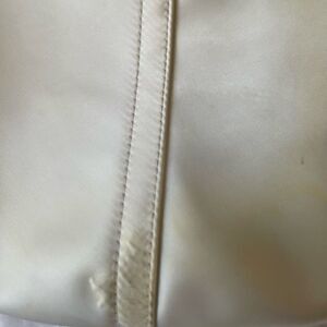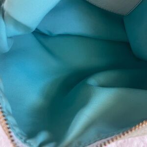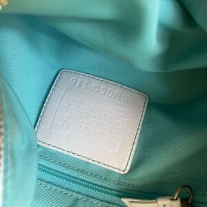 Coach Hampton off white Nylon Satchel turquoise blue charms & tan leather trim front pocket top zipper the inside lining has a side zipper pre owned in good used condition the bag has some transfer marks on the trim of the front pocket and back no tear see all pictures any questions please message..F5