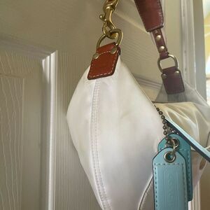 Coach Hampton off white Nylon Satchel turquoise blue charms & tan leather trim