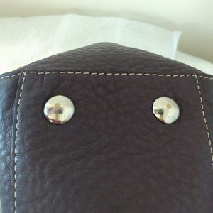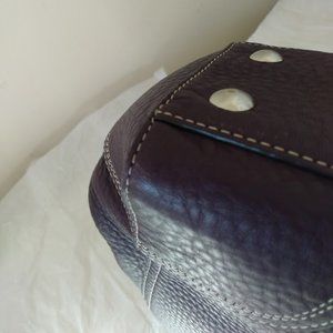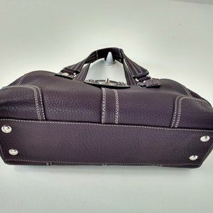 G0973-F13961. This bag is in very good condition. Purple pebble leather with silver tone accents, tan lining, contrast stitching. Turn lock and zip opening, opens to one compartment. One outer slip pocket, one inner lining zip pocket, one inner small pouch pocket.