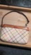 Chic Coach wristlet with a vibrant plaid pattern. Features a tan leather trim. Ideal for adding a pop of color. The handle is twisted/funky. some dinginess to interior, especially around the zipper. 7.5" wide 10" long with handle (4" w/o) 2" wide bottom