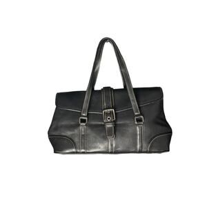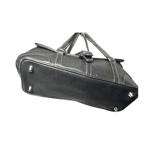 2000's Black coach leather bag with silver hardware. Interior has 2 slip pockets and a zipper pocket. This bag has been well loved and there is wear at the corners, some creasing as photographed. Interior is clean, otherwise free from stains or odors. This smoke-free home