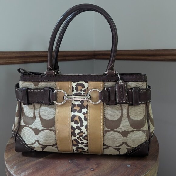 Coach Hamptons signature carryall with cheetah print and tan leather stripe, number E05Q-8K10. Brown and tan Coach logo fabric with brown leather details, cheetah print stripe, and silver-toned hardware. Leather handles have a 6-inch drop. The bag also has a front buckle, zipper closure, and metal feet. Gently used in good condition. Tan leather stripes on the front of the bag have some light scuff marks. Smoke-free home.