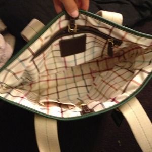 Super cute Coach green/tan shoulder bag with plaid inside. Front pocket and back pocket, along with spacious inside with small zipper pocket. Never used, like brand new. Comes in with Coach storage bag.