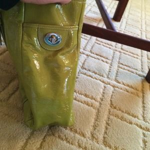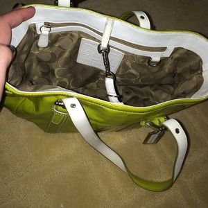 Coach green apple patent leather handbag. White leather and classic coach print fabric details on the interior. Beautiful silver hardware. Tote bag. Spacious and great compartments.