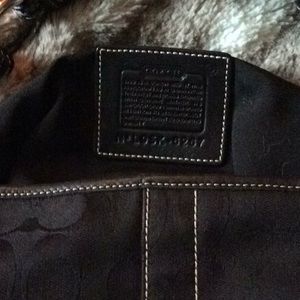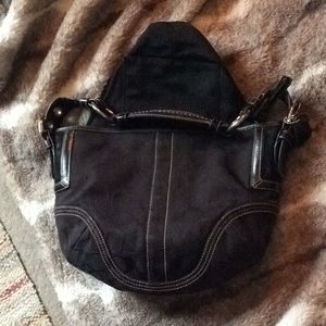 Coach black with silver metal shoulder bag gently used . Great condition. Does fit comfortably on the shoulder. Cloth material with beautiful leather & cloth strap.