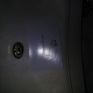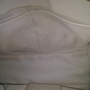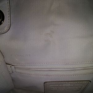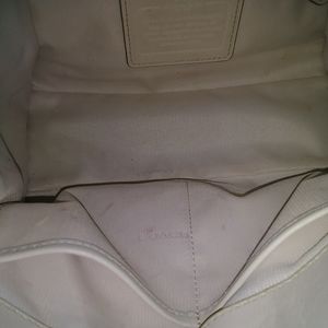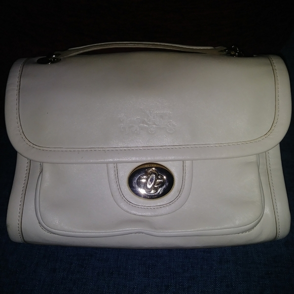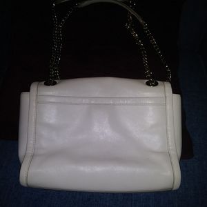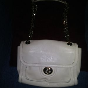 Medium white leather Coach bag with chain straps. The bag can we worn long or short with straps. Outside of bag is in Excellent condition. Inside needs a cloth wash pic will show
