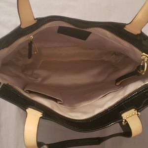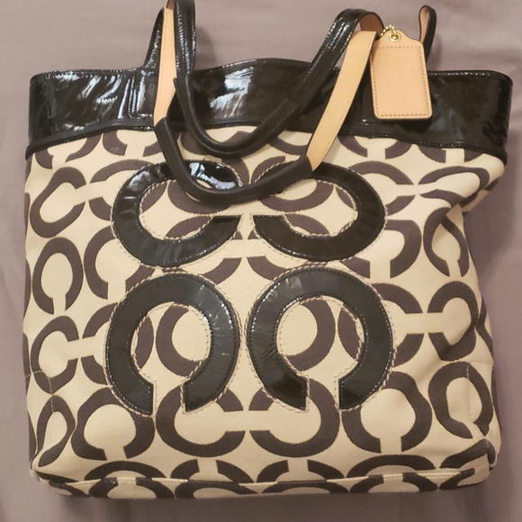 Adorable, large Coach bag. Perfect as a diaper bag, weekend tote for your beauty products, or a handbag! It is a tape canvas with chocolate brown "C"s and black patent leather detail. Nor tips or stains, no signs of use at all.