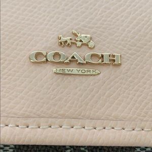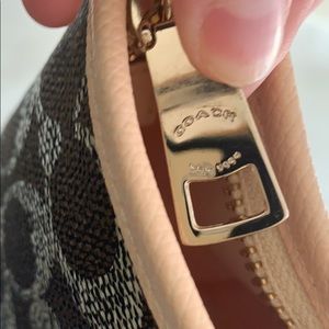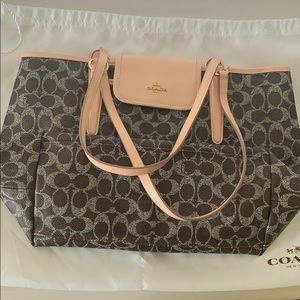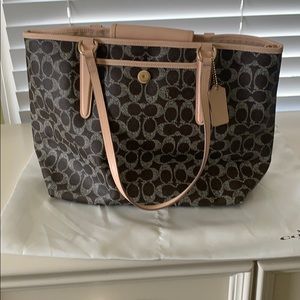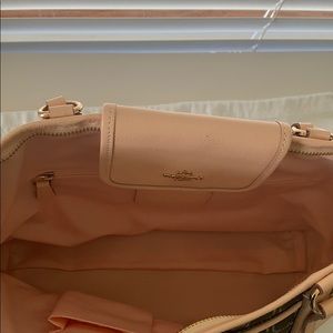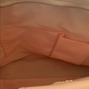 Never used gorgeous bag with gold hardware and pink detailing. Very spacious at about fifteen inches wide by 10 inches tall. Comes in original satin like bag.