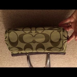 Like new Coach handbag. Pretty purple color. Only has small mark on inside. Bottom is clean. No tears. Measures 10” long 4” wide 9.5” tall.