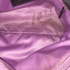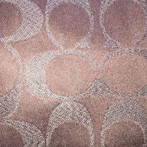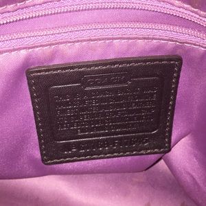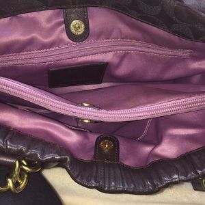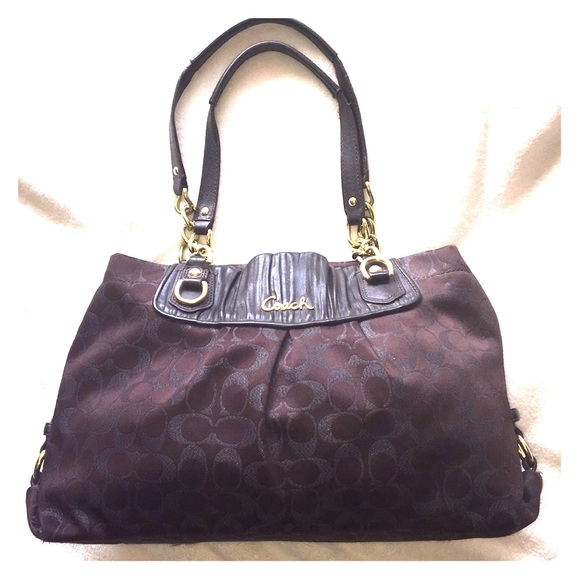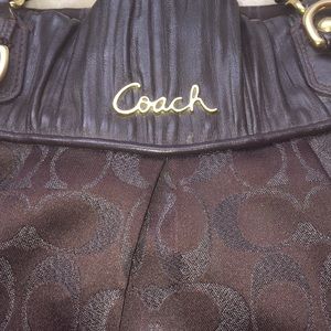 Coach Handbag. GUC. Beautiful chocolate brown exterior with leather accents and gold tone hardware. Very Spacious interior. A few satins inside (see photos). One center zipper pouch and one pouch to either side with magnetic snap closure at top. One side had additional sipping pocket and the other has two open pockets perfect for a cellphone and car keys or lipstick! Approximately 17”X10”.
