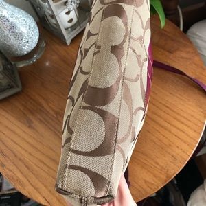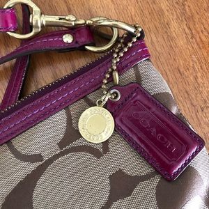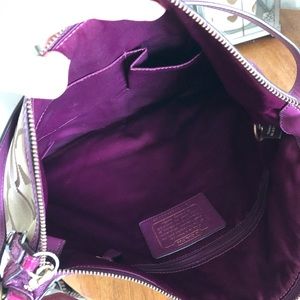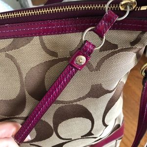 Cute magenta/plum colored coach canvas and leather handbag! Detachable crossbody strap. In great condition with a small mark on side of bag on magenta strip please see picture. Ask me any questions!