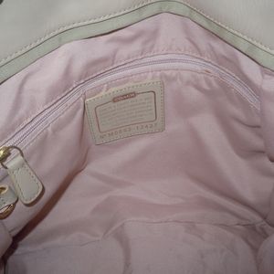 Light gold colored Coach Handbag, with leather handle in excellent condition.