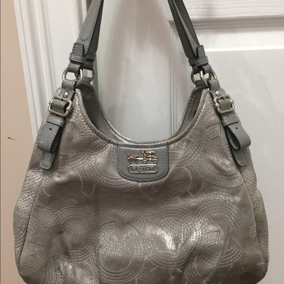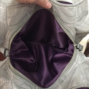 Silver with rich purple lining. Multiple compartments, gently used. Smoke free, pet free home.