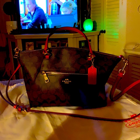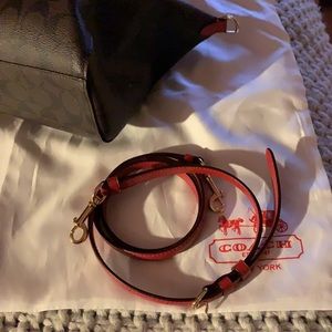 Red trimmed Coach bag, like new only used twice and I always take care of my things! Comes with its duster! Absolutely 100% AUTHENTIC! You will never see a knock off in my closet!!! Enjoy 😊