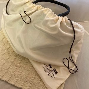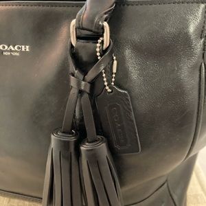 This Coach bag is a beauty. Large, but not too big. Black leather. It measures 13” long x 5” wide at base. It is 10” tall to top of bag, 17” to top of handles. It has been lovingly cared for and stored properly in dust bag. One outside zipper pocket. Interior cell phone slot, with additional larger open slot pocket, along with large zippered interior pocket the length of the bag. A wonderful Coach handbag in excellent condition. Purchased at Coach in Boston. Dust bag included.