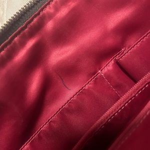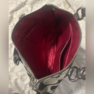 Grey Coach material Handbag with Hot pink satin interior. Has one small pen marking inside near pocket, rest of purse looks brand new! Large bag, can carry a TON!