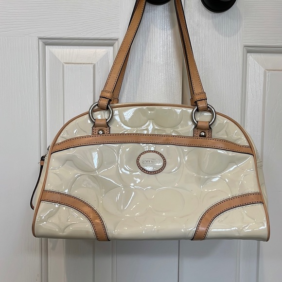 Coach handbag. Glossy cream leather with tan detailing, light mauve interior. 2 outside pockets, 3 inside pockets. Great condition, with only one small smudge next to top zipper closure shown in picture.