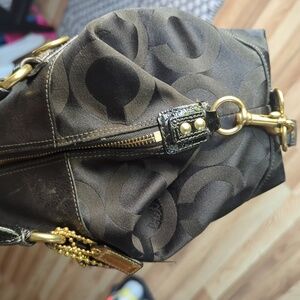 This is called the Madison Sabrina or the Sabrina Madison satchel. It features a shiny leather mixed with it's signature material. The dimensions are 12(l) x 9.75(h) x 5(w). The lining is a cool pop of purple.