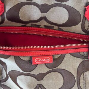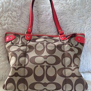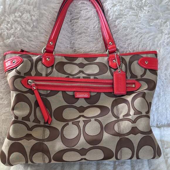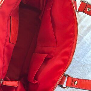 This beautiful, large handbag has patent orange trim, zippered front and interior pockets, and lots of storage. Durable and in excellent condition.