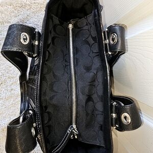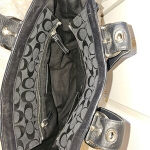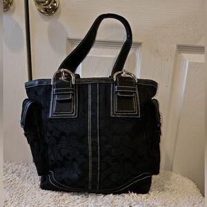 Black signature cloth and genuine leather vintage Coach handbag. 3 interior pockets and 2 exterior pockets. PRISTINE condition. Kept in dust cover.