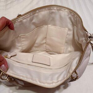 This elegant Coach satchel in soft light beige pebbled leather is the perfect mix of style and versatility. It can be carried by the double handles as a handbag or worn hands-free with the detachable, adjustable crossbody strap.