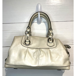 Pearl white leather exterior w Zip top closure. Creed: C1249-F15445 Dual rolled patent leather handles. 4 stud feet on bottom. Polished silver hardware Interior fabric lining is lavender, see photos for ink spots in corner of lining Large interior zip pocket and 1 open slip pocket Hang Tag attached to the front. 12"(l) x 8"(h) x 5"(w) No odors, smoke free home. Coach Ashley 15445 Metallic Leather Handbag