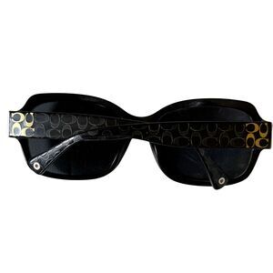 Classic Coach HC 8001 sunglasses featuring a timeless black rectangular frame with the signature Coach "C" monogram pattern on the temples in gold and black. Inside arms are finished in a soft pink hue for a chic contrast.