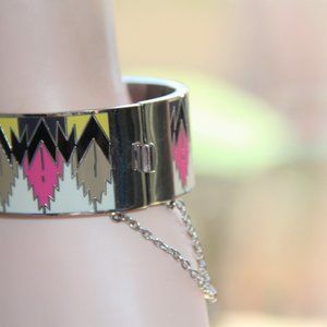 Coach Hawk Feather Enamel Hinged Bangle. Colorful Oval Silver Plated Hinged Bangle with Safety Chain. Size: Inside Circumference 6 ¾” x 1” width. Push Locking Clasp. Solid Weight 3.92 oz/111 grams. Coach New York Signature Logo. Normal Wear.