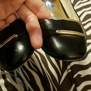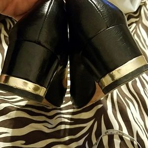 Black Coach heels with gold buckle labeled with coach brand. Heels have gold around bottom. No wear except on sole. Beautiful shoe. Classy.