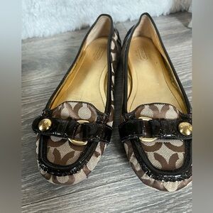 Coach Hellen 'C' logo driving buckle loafers in brown canvas/patent. Size 8.5