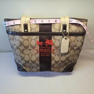 Coach Heritage Signature Stripe Tan/Brown/Red Bucket Bag in used condition.