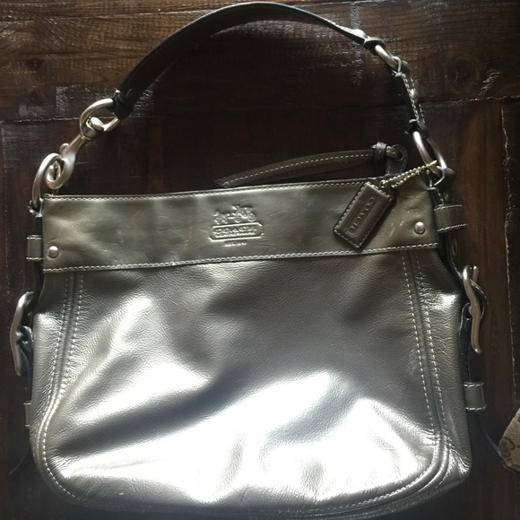 Gunmetal Patent Leather Coach bag. I loved this bag for many, many years. It has some wear on the inside, stains from carrying water bottles and makeup over the years. The outside is in awesome shape. Great bag. No Trades. Price is flexible.