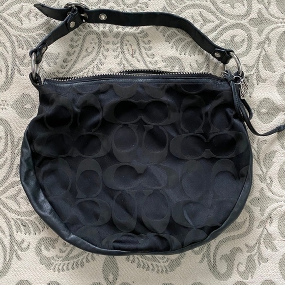 Black Coach Handbag in good used condition. This bag is from a smoke-free/pet-free home and features the signature logo design on the fabric with a leather strap. The bottom of the bag is soft black leather and the bag has shiny silver hardware. Inter fabric silver. Leather Coach tag included in pocket, as it fell off through normal use. No other obvious signs of damage. Offers accepted.