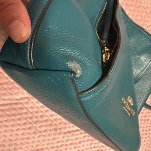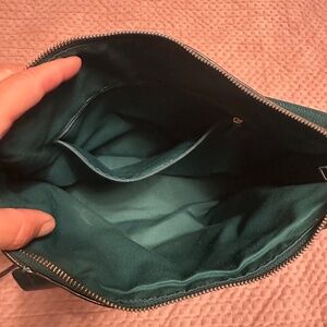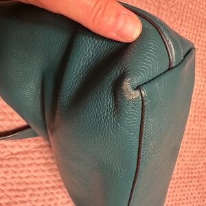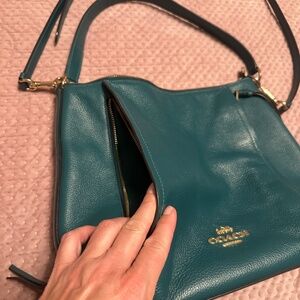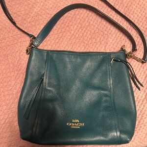 Green Coach hobo bag with two zippered front pockets. Cross body and shoulder straps. Some wear as pictured. Super soft pebbled leather.