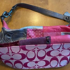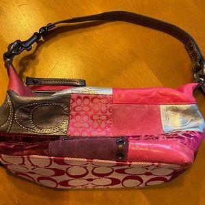 Small Coach Holiday Patchwork Purse in Pink. Like new condition. 9" long x 4.5" high x 3.5" wide. 10" strap.