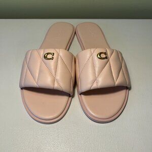 An easy slip-on-and-go design, Coach's plush quilted leather Holly is an effortlessly sophisticated style. The versatile flat sandal features a comfortable padded footbed, a rubber outsole for added traction and Coach's polished Signature for a heritage touch.