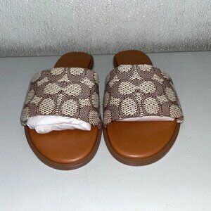 Step into effortless designer style with these Coach Holly Sandals in Signature Textile Jacquard. The black/brown Coach “C” logo upper gives you that recognizable designer look, and the easy slip-on slide design makes them perfect for everyday wear, travel, poolside, or pairing with dresses and denim. Low profile, comfortable footbed, simple and polished.